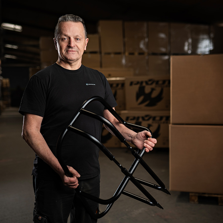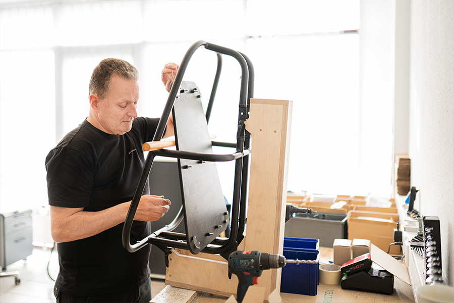 In der Carrier-Produktion müssen neben der Montage auch die begleitenden Schritte genauso gewissenhaft erfolgen, wie bei den Fahrrädern. Produktionsplanung, Materialbestellung, Bestands-Monitoring, Logistik, Qualitätskontrolle, Kundenkommunikation. „Mit meinem Standbein bin ich fest in diesem Bereich verortet, das Spielbein bleibt beweglich für andere Themen,“ erzählt Enrique weiter.