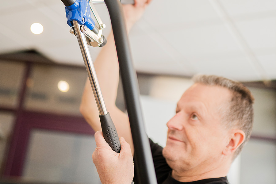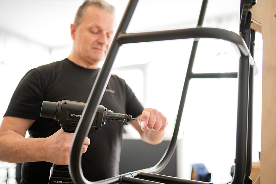 „Hier werden keine E-Bikes und Kompletträder montiert, sondern ausschließlich Carrier für Lastenräder. Das ist unser zweiter Produktionsstrang, neben der Fahrradmontage,“ erklärt er. „Die Arbeitsweise und Qualitätskontrollen, das ist alles gleich, unser Standard eben. Da Geräte, Vorrichtungen und Stückzahlen für den Carrier-Bau aber ganz anders sind, haben wir hier diese separate Strecke eingerichtet.“